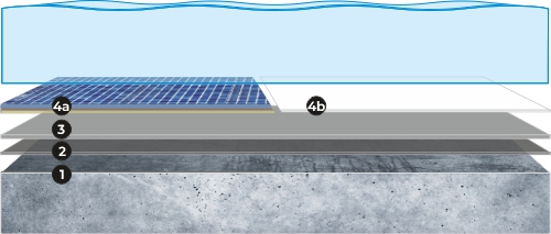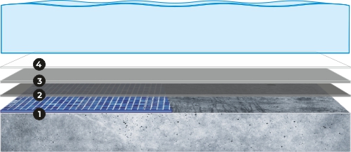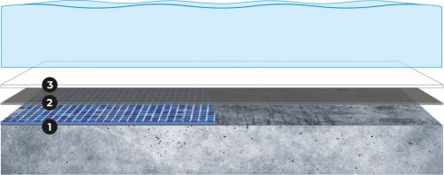 1. support (béton ou céramique) | 2. WET Primer | 3. polyurée Tecnocoat P-2049 AL
